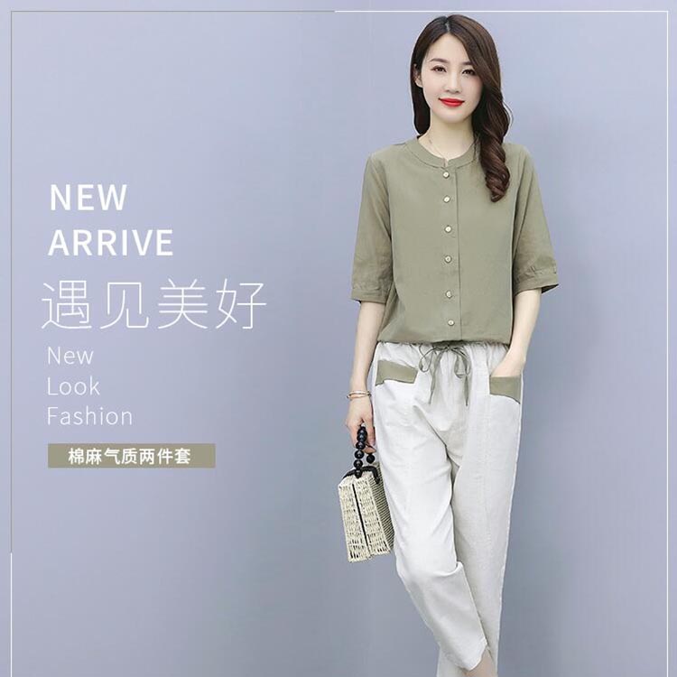 休闲裤女棉麻女装套装女2021夏季新款优雅洋气时尚气质修身小个子亚麻两件套